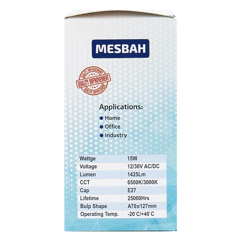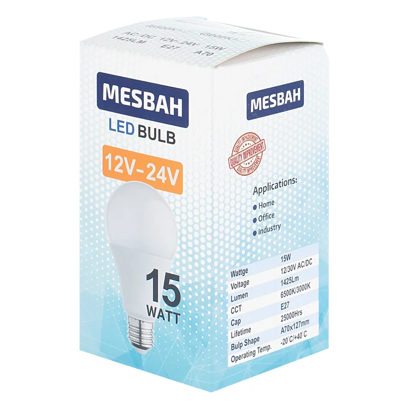 این لامپ ال ای دی (LED) مصباح برای استفاده در ولتاژ بین 12 الی 30 ولت ساخته شده است. این لامپ هم با ولتاژهای AC قابل استفاده است و هم با ولتاژ DC. این لامپ توان مصرفی 15 وات را دارد که نور مناسبی را تولید می کند و همچنین چون از تکنولوژی SMD LED استفاده کرده است، طول عمر بالایی دارد. این لامپ توانایی روشن شدن توسط انواع باتری ها از جمله باتری ماشین های سبک و سنگین را دارا می باشد. همچنین از آن می توان برای روشنایی استخر ها، جکوزی و دیگر محیط های مرطوب استفاده کرد. این محصول هم با نور سفید (مهتابی) و هم با نور زرد (آفتابی) تولید شده است.
